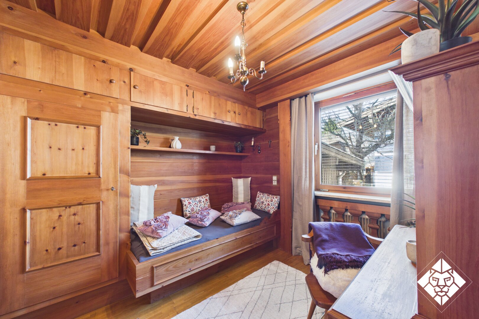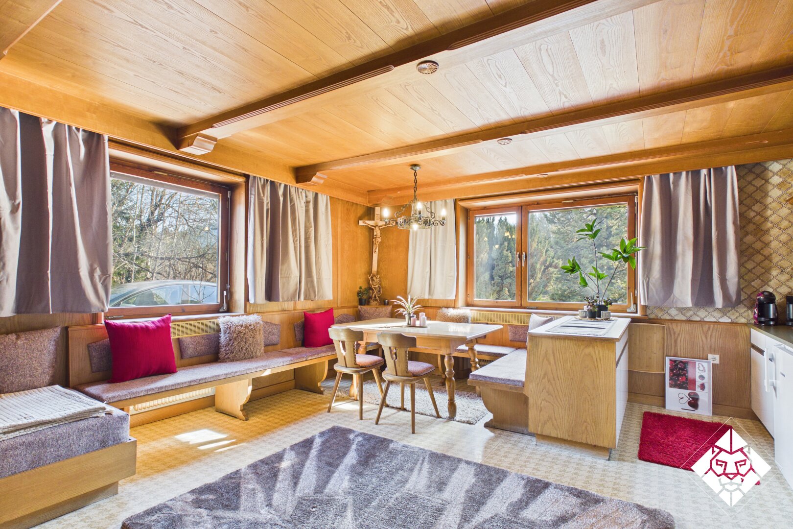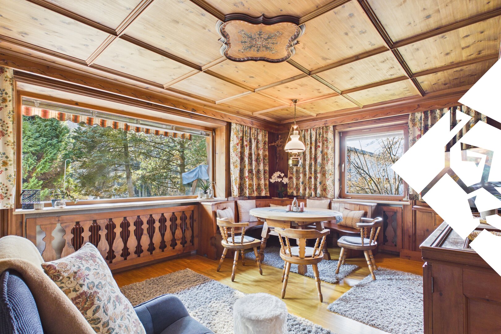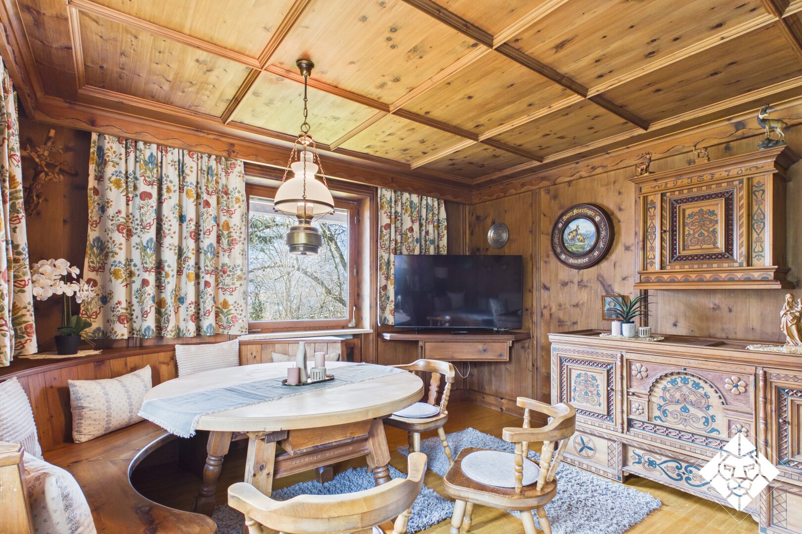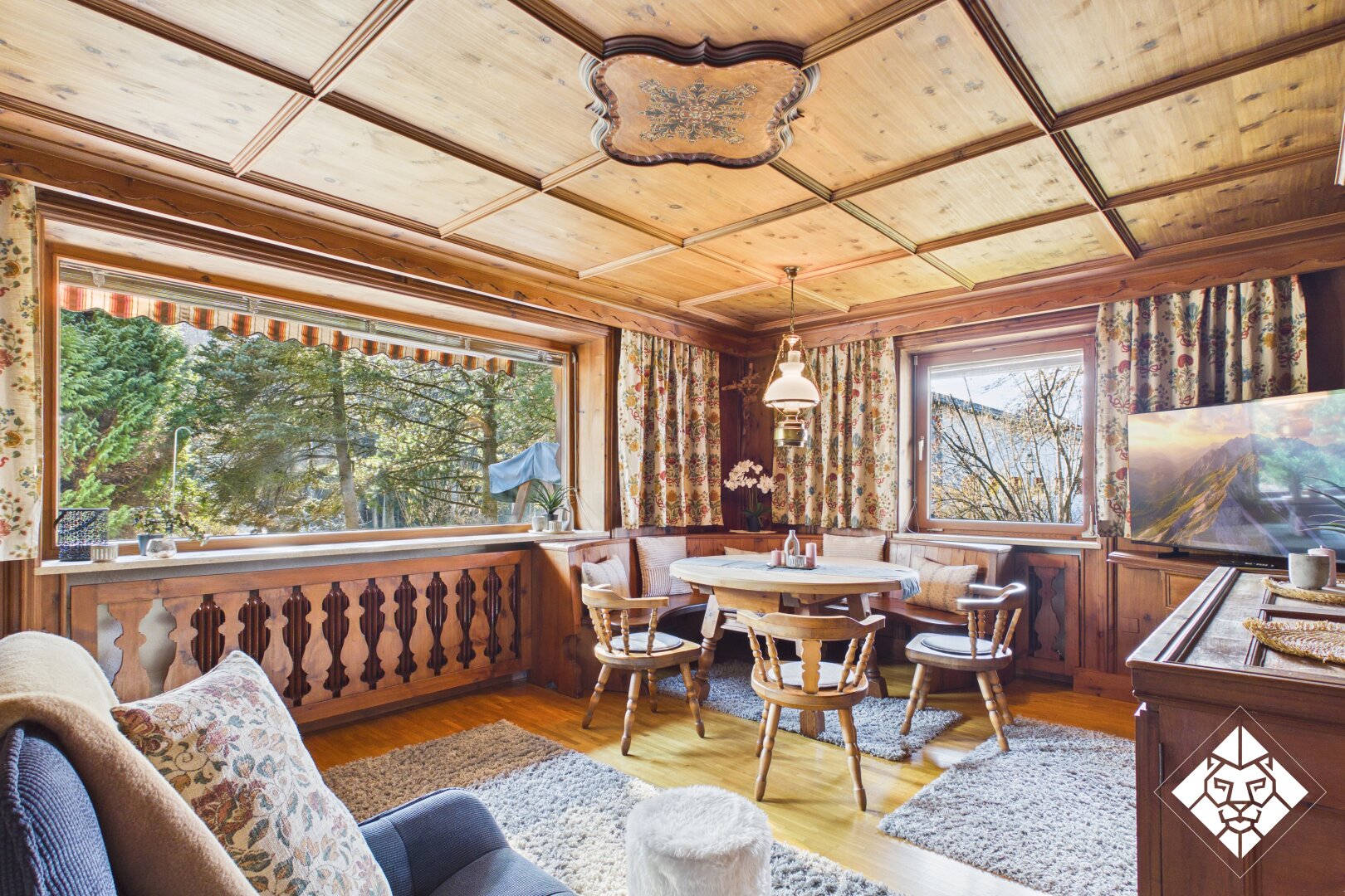 Das Herzstück der Wohnung bildet die großzügige Wohnstube, die mit ihrem traditionellen Flair ein perfekter Ort für gesellige Stunden oder ruhige Abende ist. Der Kachelofen sorgt dabei an kalten Tagen für wohlige Wärme und unterstreicht den alpinen Charakter des Wohnraums.